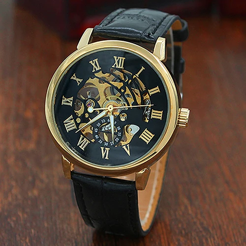 شفافة الهيكل العظمي التلقائية الميكانيكية ووتش الرجال حقيقية حزام جلد أعلى العلامة التجارية الفاخرة الذاتي لف الرجال الرجعية ووتش ساعة