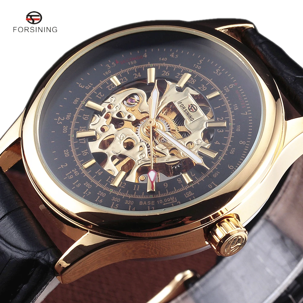 وانت debido aشراء Mechanical Watches, entonces 2018 FORSINING تصميم الأزياء الذهب الأسود ساعة اليد الرياح الميكانيكية ووتش للرجال أسود حلقة من جلد Relogio الذكور الشحن مجانا tal vez poner interest