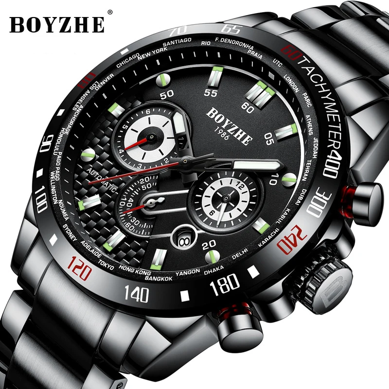 معرض ل BOYZHE جديد الرجال الرياضة الميكانيكية التلقائية ووتش للماء العلامة التجارية الفاخرة الفولاذ المقاوم للصدأ العسكرية رجل الساعات Montre أوم ساعة