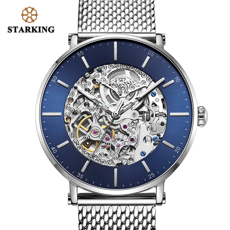 استعارات ل STARKING ووتش العلامة التجارية الفولاذ المقاوم للصدأ الذكور ووتش التلقائي حركة الرجال ساعة اليد 5ATM الأزرق الهاتفي ساعات آلية ساعة AM0275