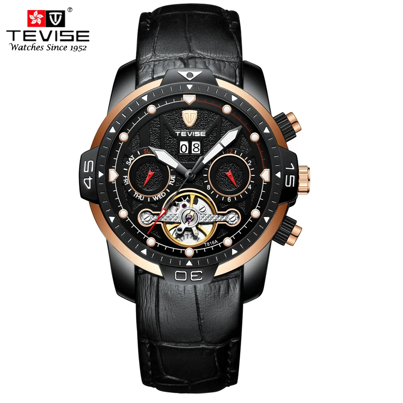 شراءمعلومات اضافية TEVISE الأعمال الرجال التلقائي ساعات آلية الذاتي الرياح جلدية ووتش توربيون السيارات تاريخ أسبوع التقويم المعصم