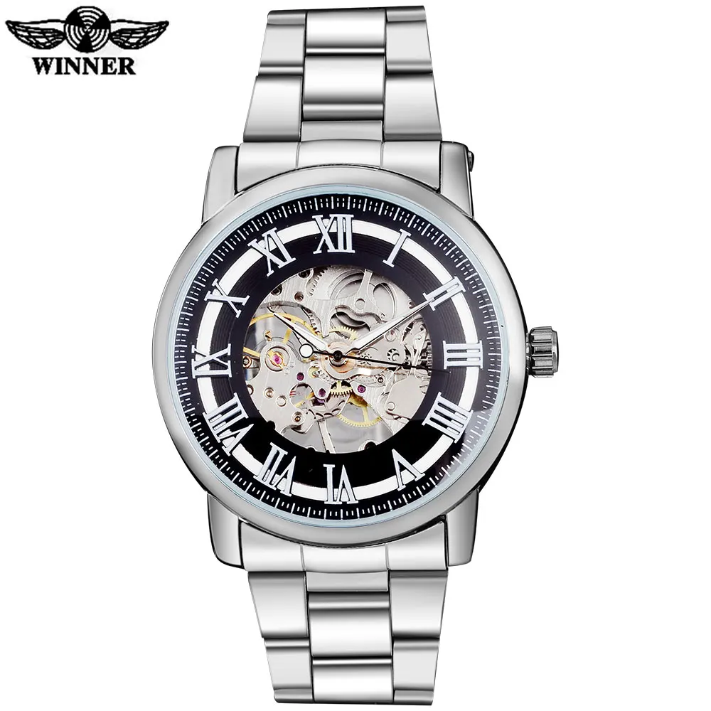 استعارات من الفائز الأزياء الأعمال الرجال الميكانيكية الساعات العلامة التجارية الفاخرة الرجال الهيكل العظمي سوار الصلب الفرقة الساعات الذكور الفضة حا...