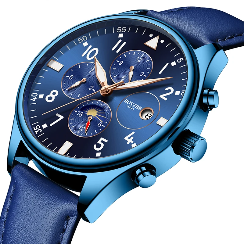 البحث عن معلوماتمعلومات اضافية BOYZHE الرجال التلقائي الميكانيكية ووتش الأعلى العلامة التجارية عارضة الازياء جلدية القمر المرحلة أسبوع مضيئة الرياضة الساعات relogio masculino
