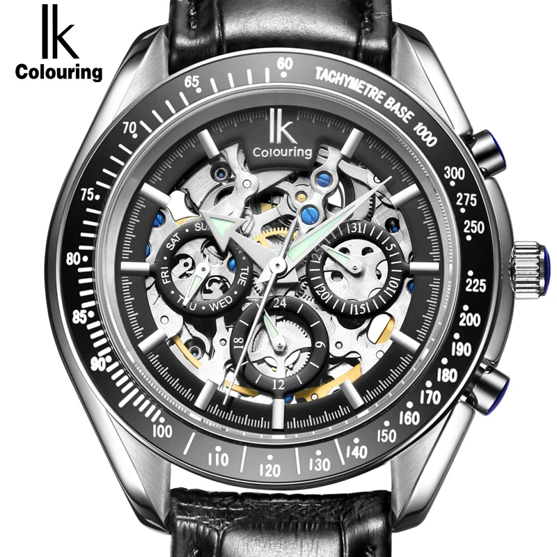 معرض ل IK العلامة التجارية الفاخرة التلقائي ساعات آلية الرجال الفرعية الهاتفي وظيفة تاريخ 24 ساعة عرض جلد طبيعي الهيكل العظمي ووتش relojes