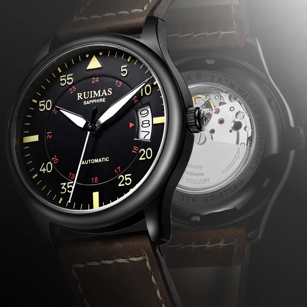 البحث عن معلوماتمعلومات اضافية الأزياء اليابان التلقائي Movt ووتش الرجال حزام من الجلد الأعمال ساعات آلية RUIMAS الذكور ساعة المعصم Erkek كول الساعاتي