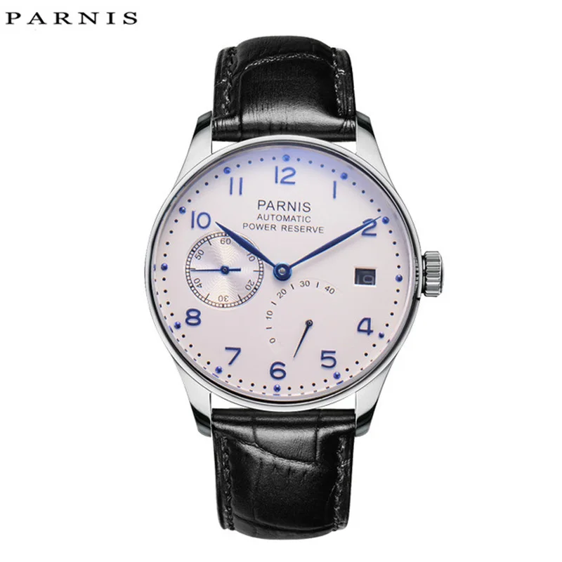 البحث عن معلوماتمعلومات اضافية Parnis 43 مللي متر ساعات آلية الرجال 2018 التقويم للماء التلقائي الذاتي الرياح ووتش الأسود الفضة
